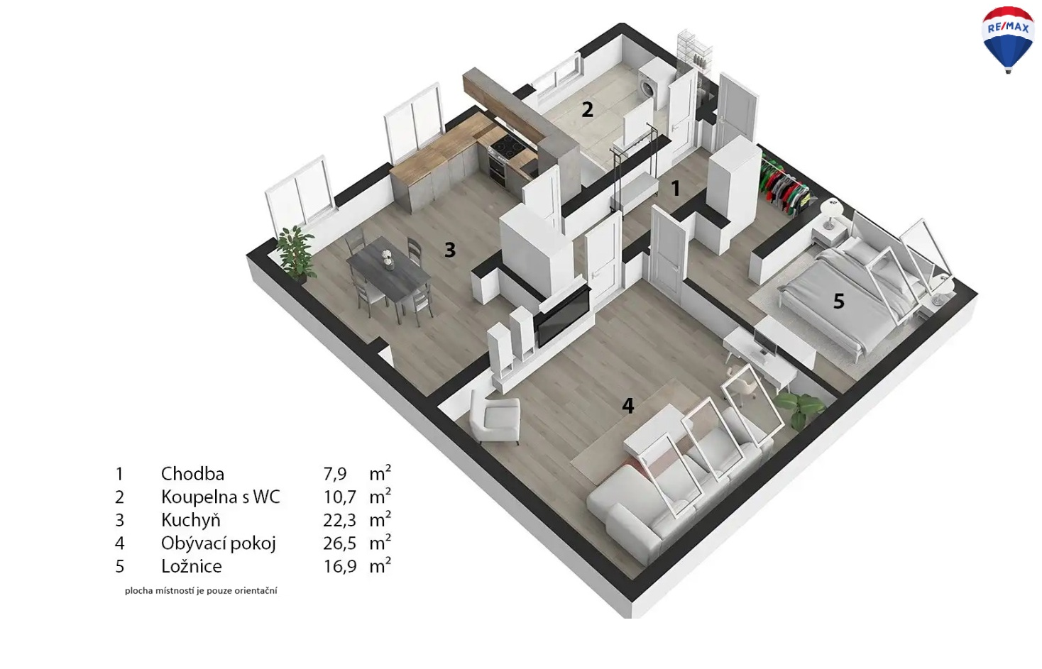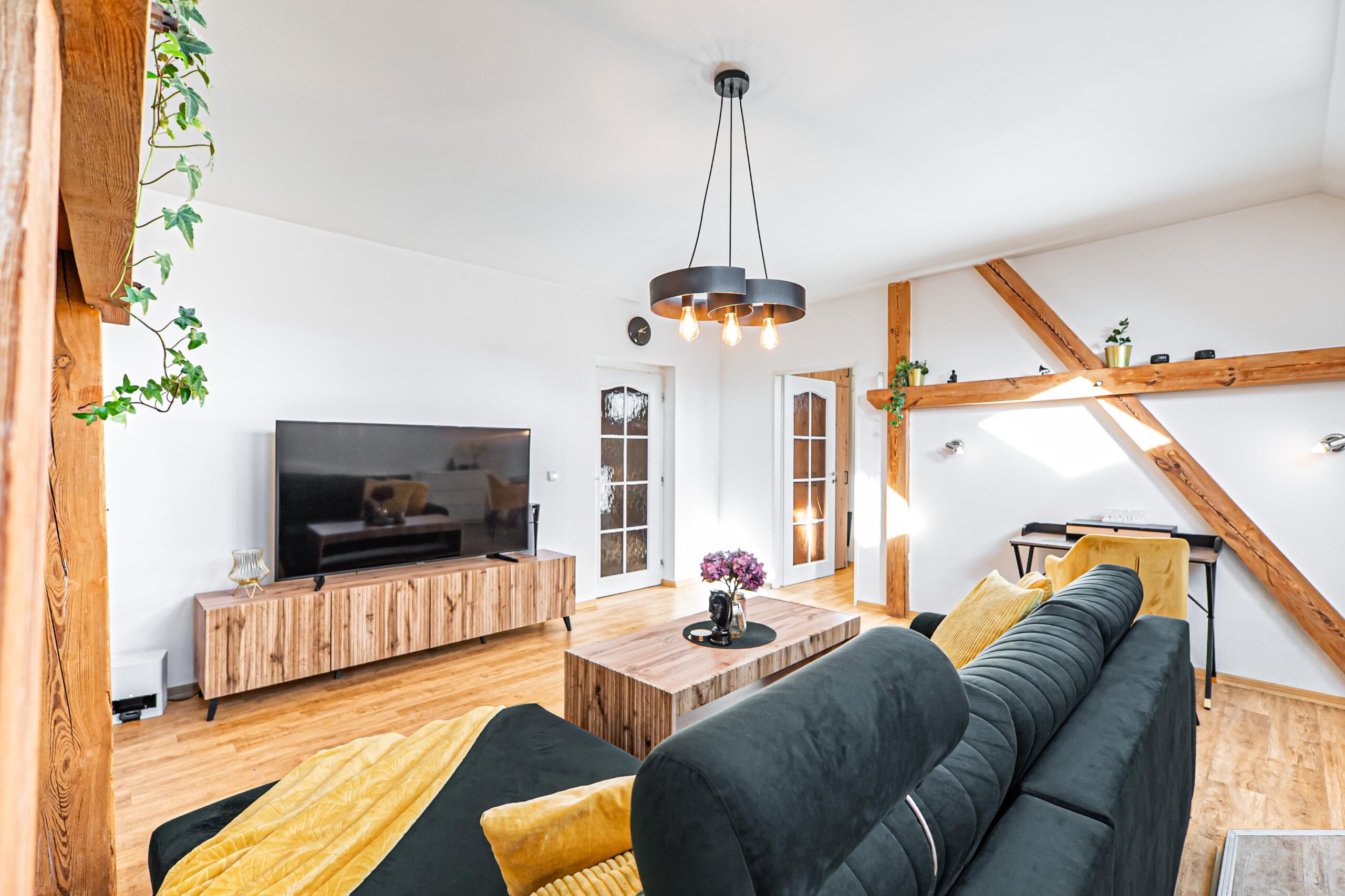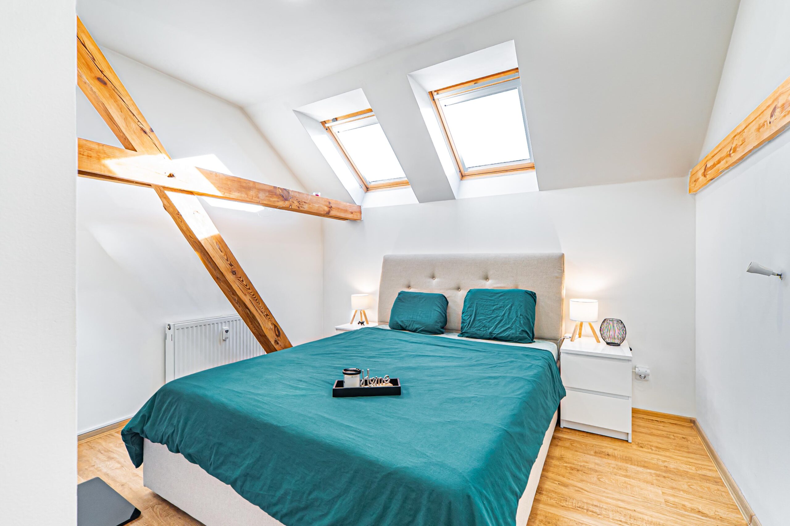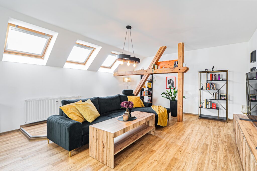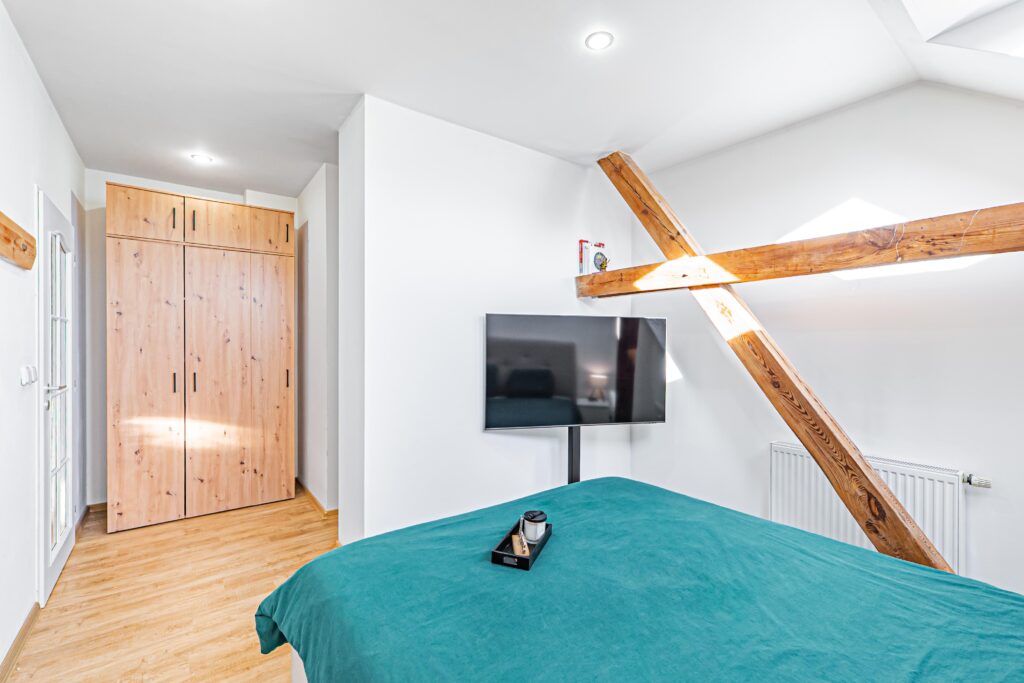Byt vznikl jako nástavba původních půdních prostor a nabízí autentický charakter, který v běžné novostavbě nenajdete – přiznané dřevěné trámy, střešní okna a příjemné přirozené světlo po celý den.