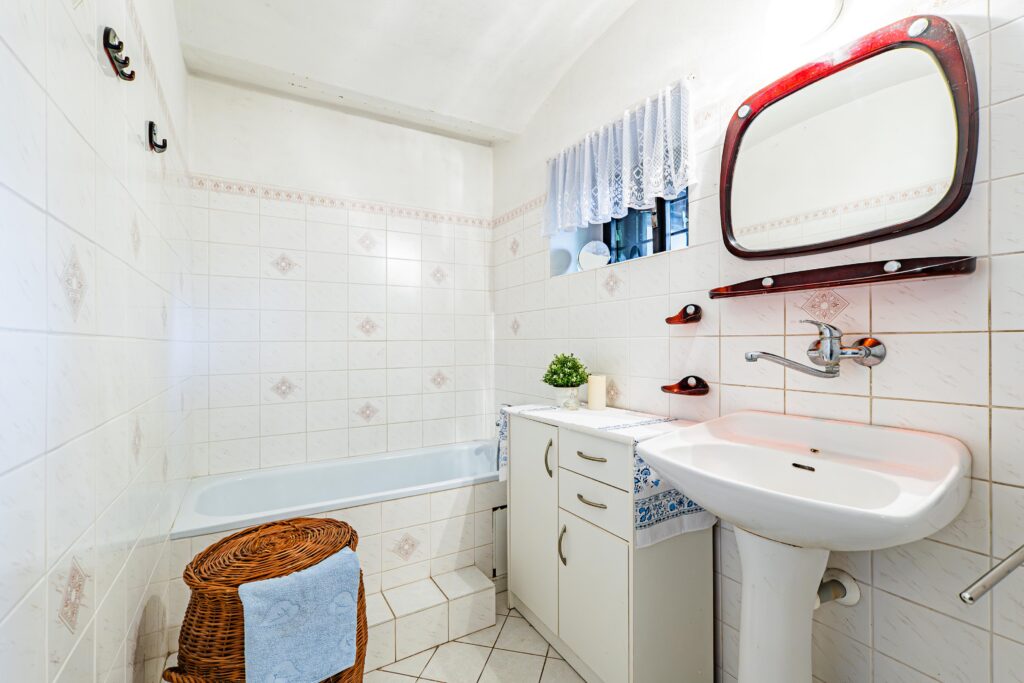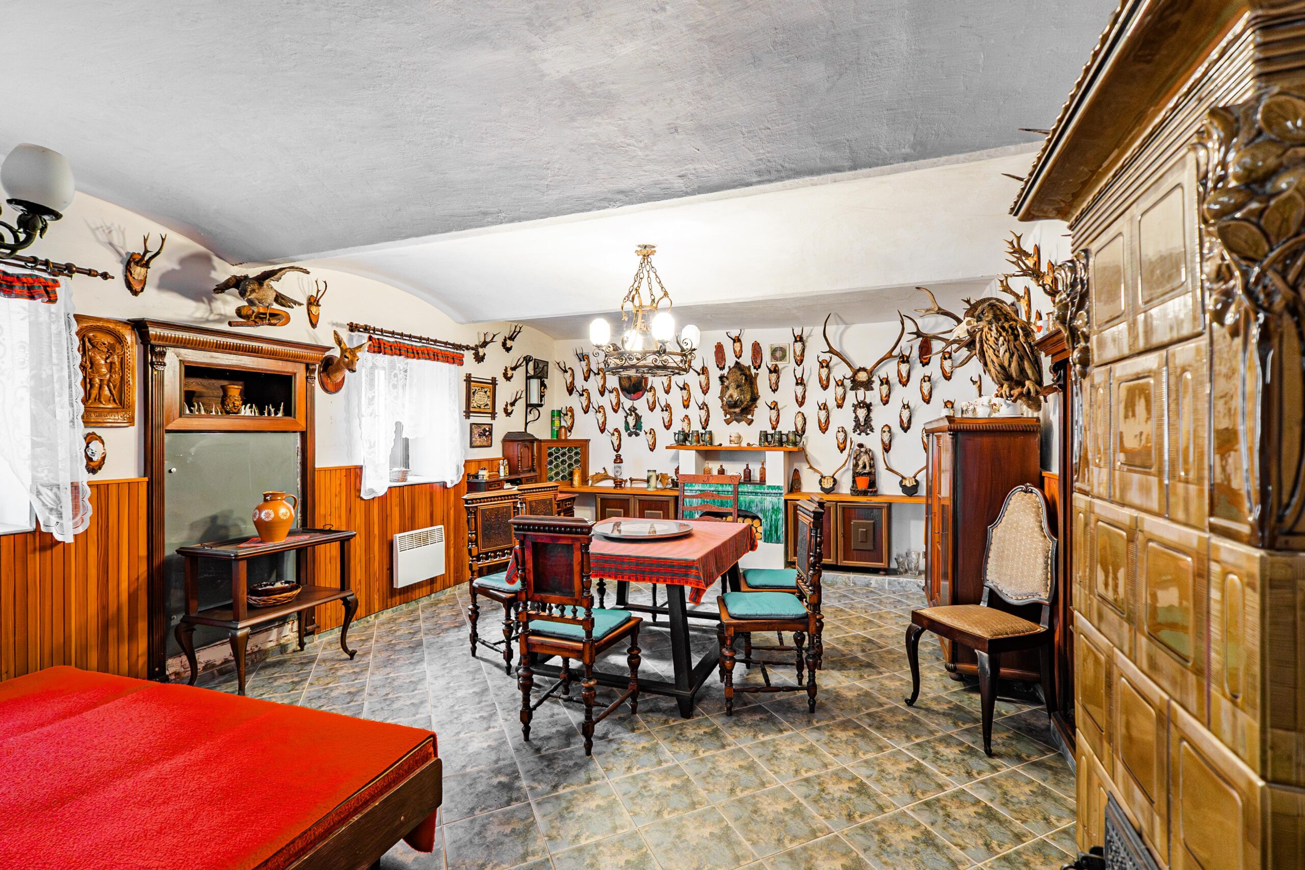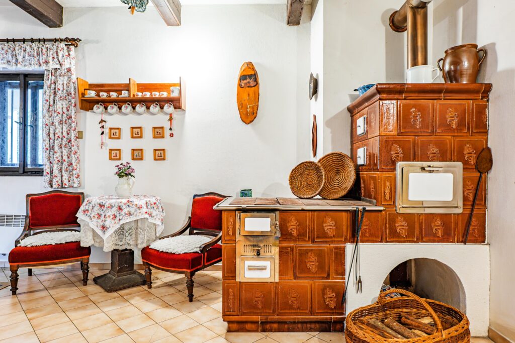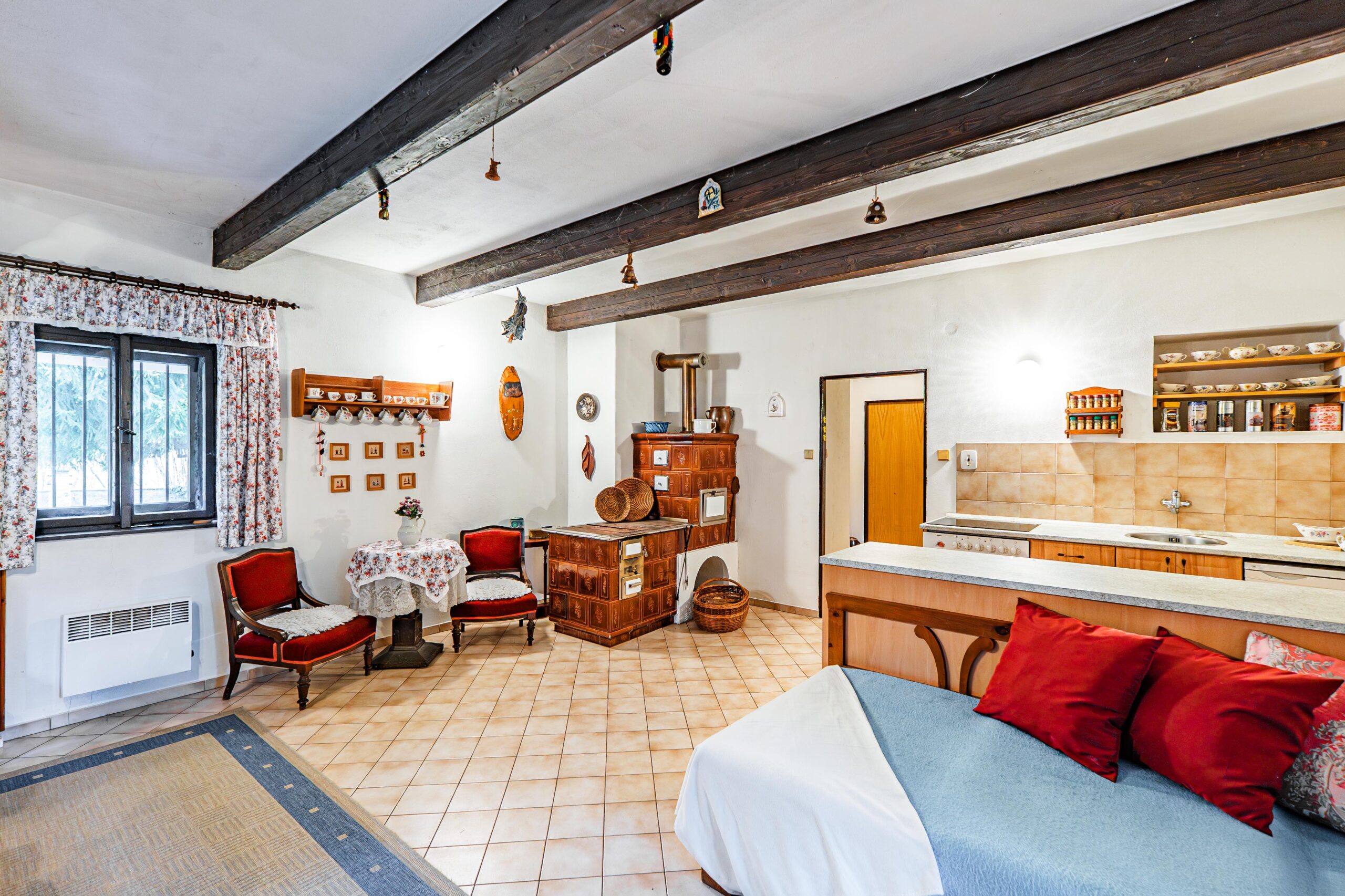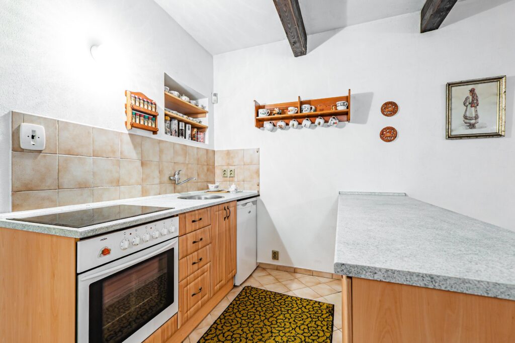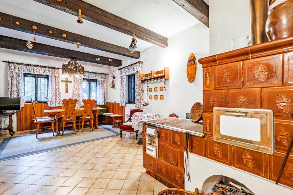 Obytný prostor je rozdělen do dvou podlaží. V přízemí se nachází prostorný obývací pokoj s keramickou pecí, která slouží k vytápění i vaření, plně vybavená kuchyň s elektrickým sporákem a jídelna s kachlovými kamny. Dále zde najdete koupelnu s vanou, samostatné WC a dva úložné prostory vhodné například pro skladování potravin.