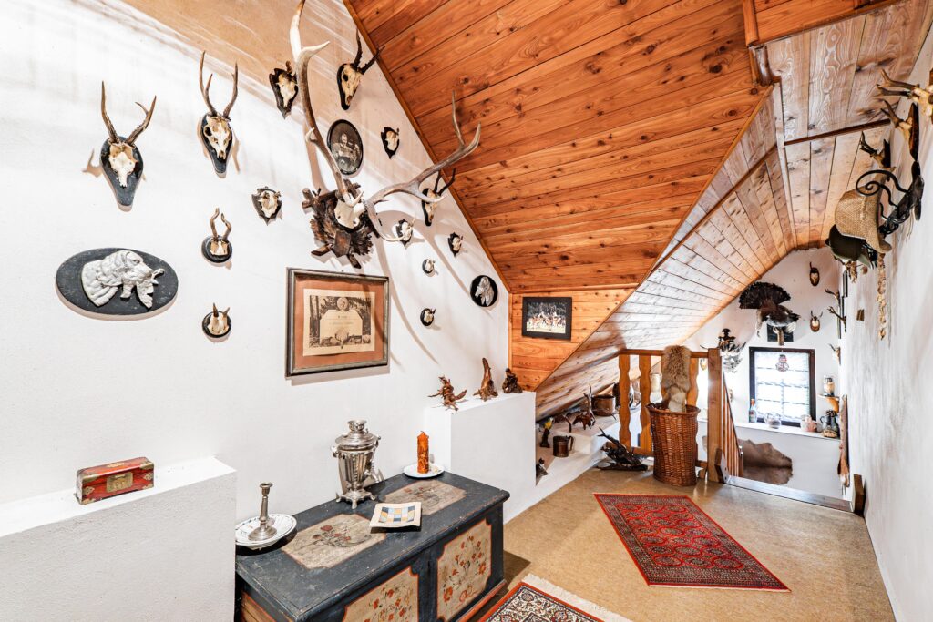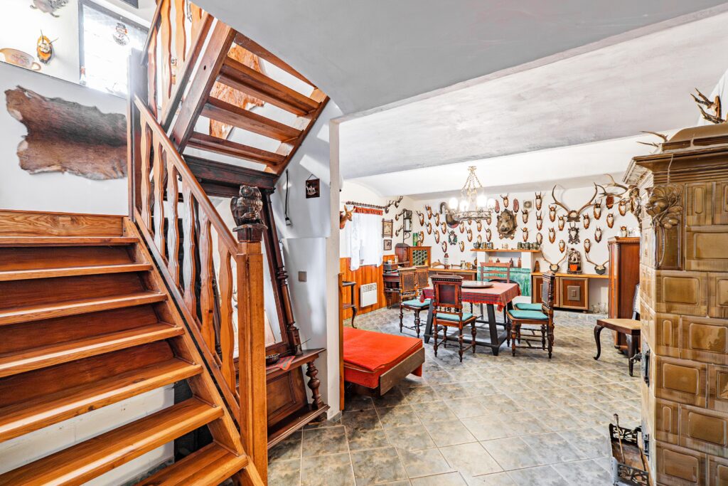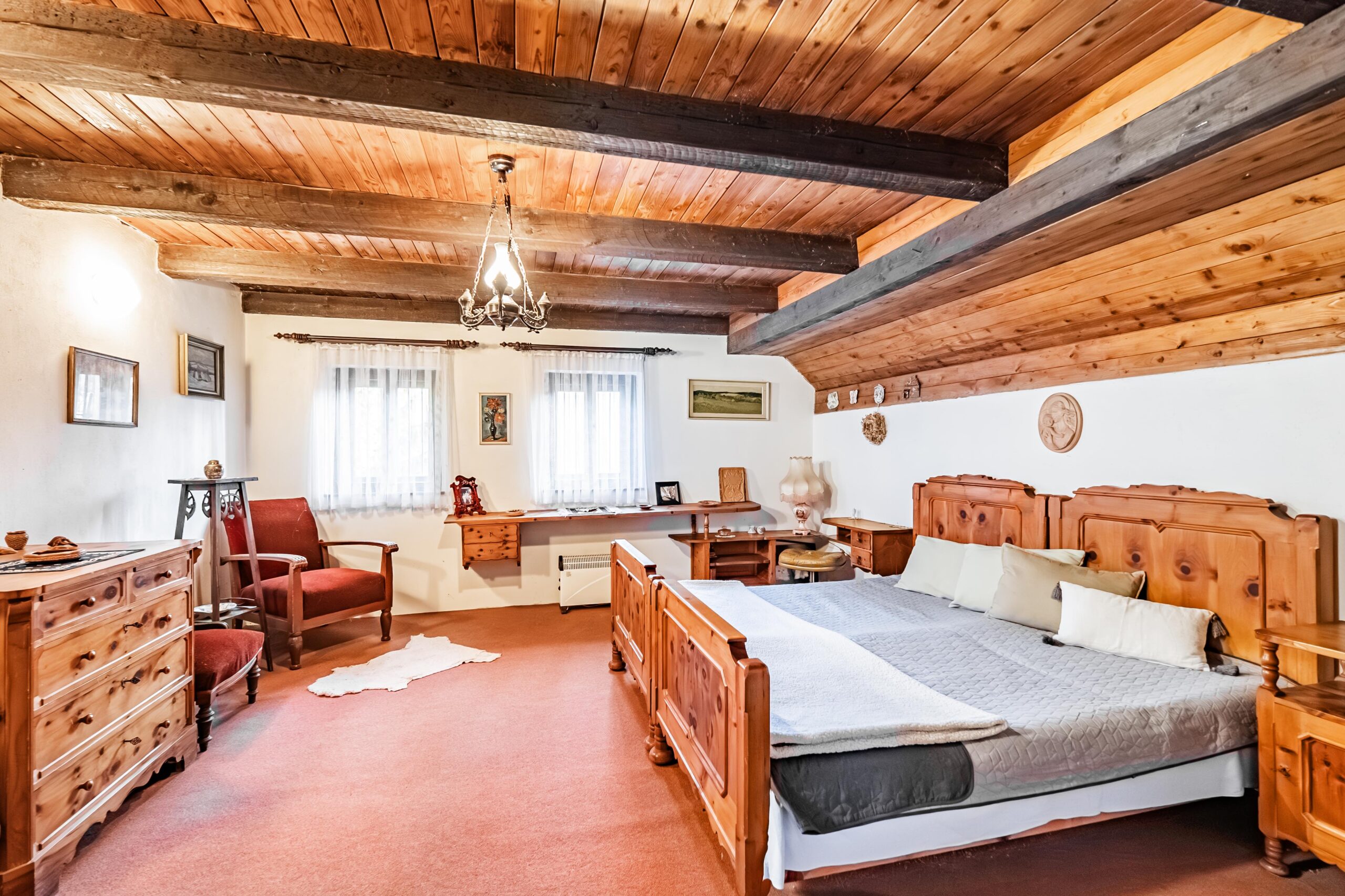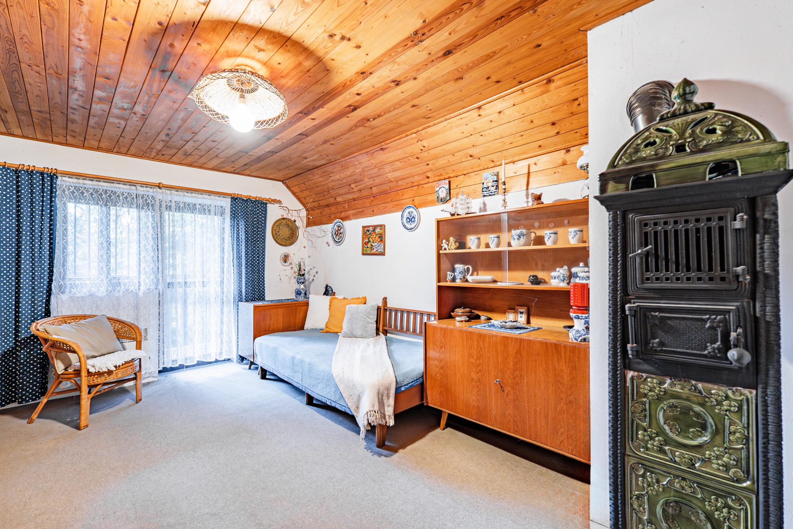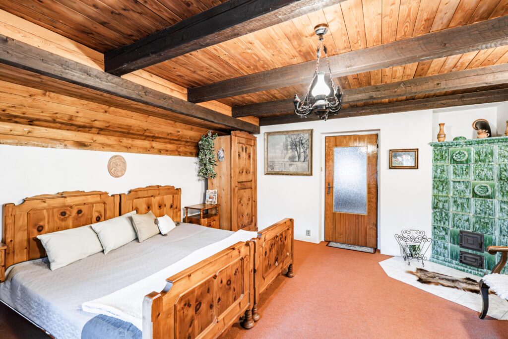 Do patra vede dřevěné schodiště, kde se nacházejí dvě ložnice a průchozí obývací místnost. Celý prostor působí útulně díky přiznaným dřevěným trámům a keramickým kamnům. Z jedné ložnice je vstup na balkon s krásným výhledem do okolní přírody. K dispozici je také druhé WC s umyvadlem a menší půdní prostor vhodný pro další skladování.