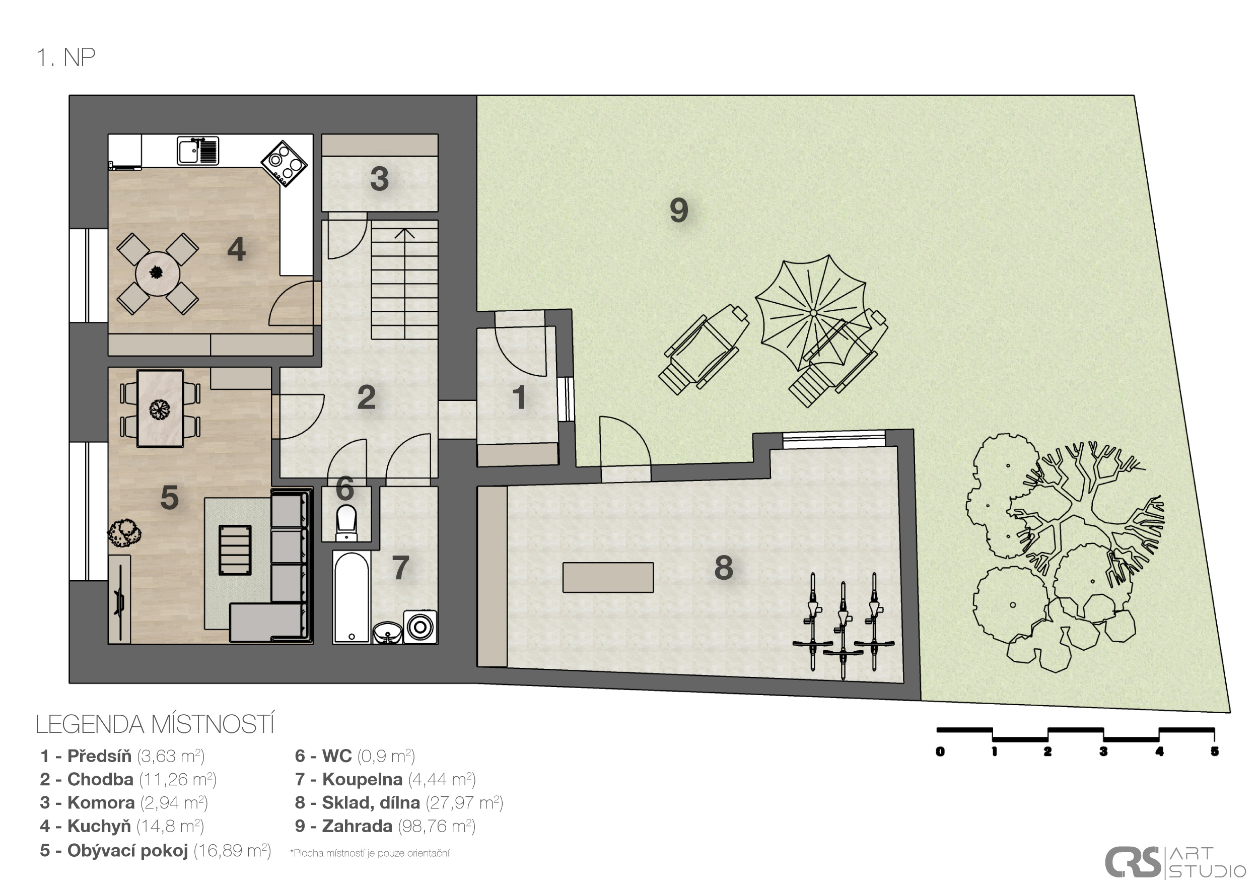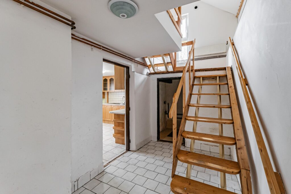 Dům se skládá ze dvou podlaží. V 1. NP se nachází vstupní chodba, koupelna s vanou a umyvadlem, ze které se dále vstupuje do technické místnosti, kde je umístěn plynový kotel značky Imergas Mini Eolo. Samostatné WC je dostupné z chodby. Zde také najdeme pokoj s výhledem do ulice a kuchyň vybavenou kuchyňskou linkou a elektrickým sporákem a troubou. Pod dřevěným schodištěm je prakticky vybudovaná komora s přívodem vody a odpadem, vhodná pro umístění pračky a sušičky.