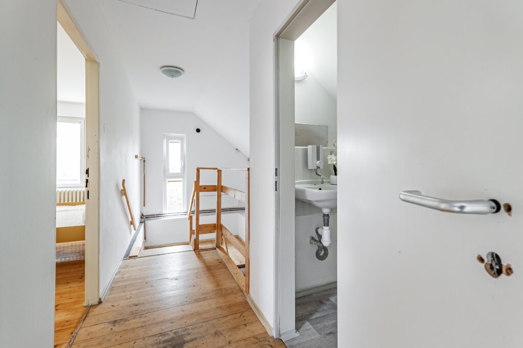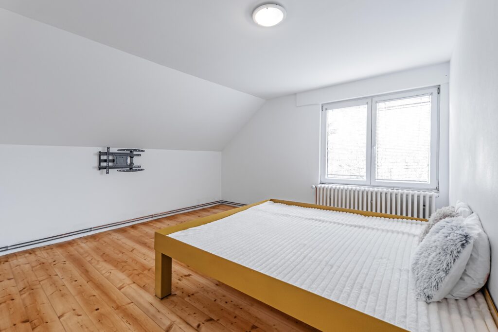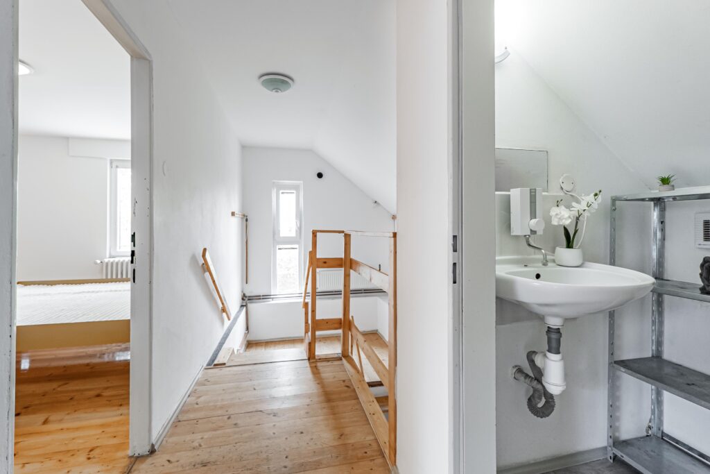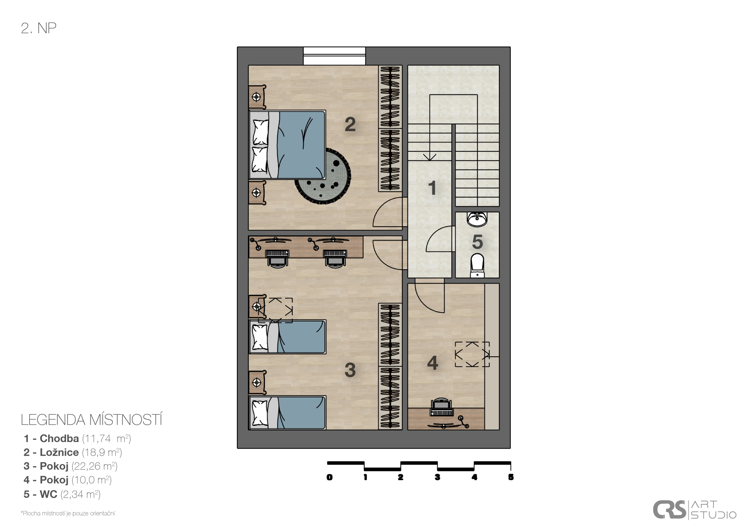 Ve 2. NP se nachází tři samostatné pokoje, z nichž každý má částečně šikmou stěnu a střešní okna, která zajišťují dostatek přirozeného světla. K dispozici je zde také další samostatné WC s umyvadlem. Celková podlahová plocha domu je přibližně 120 m².