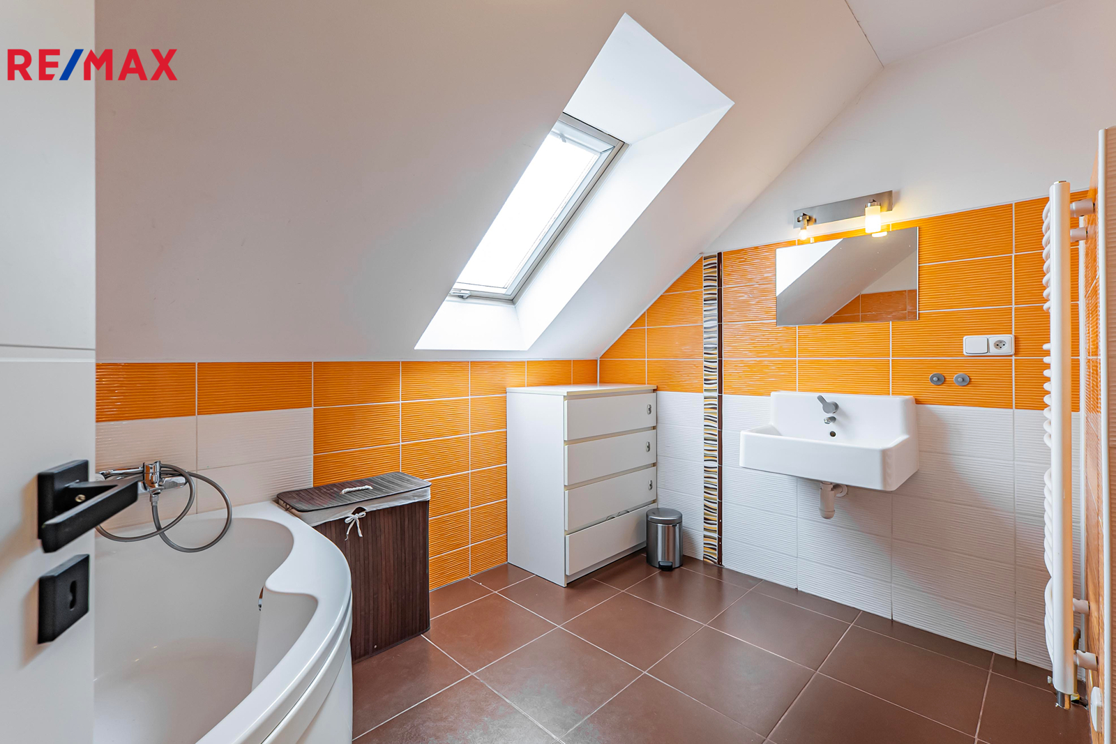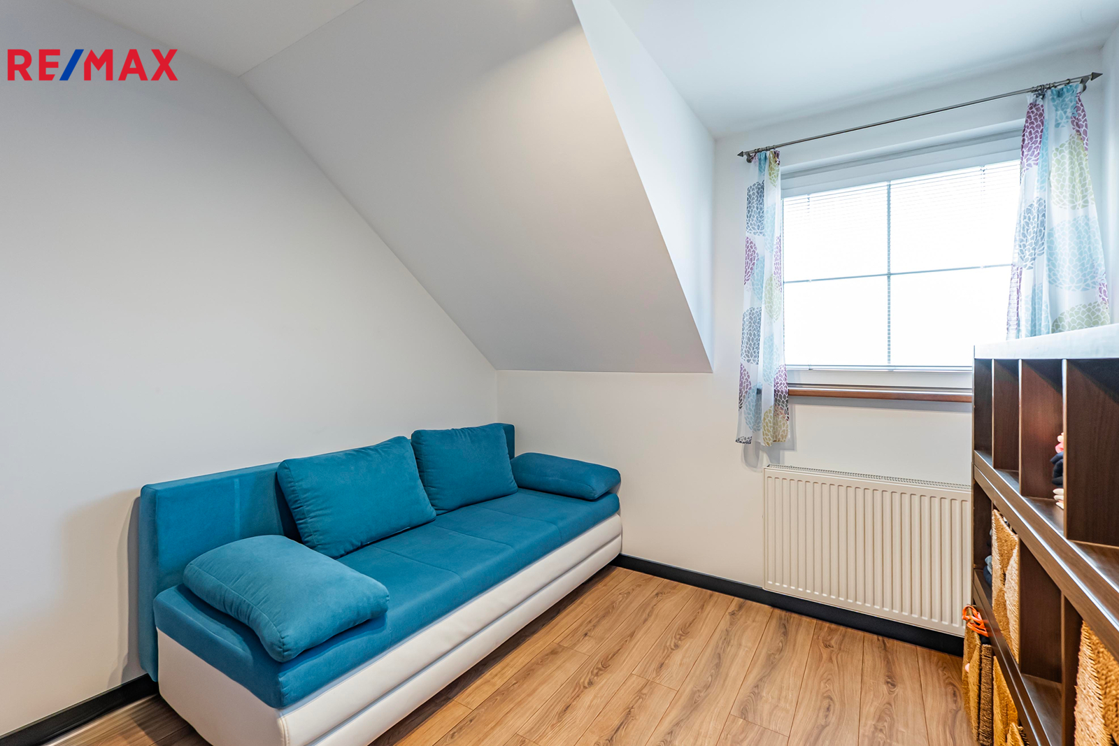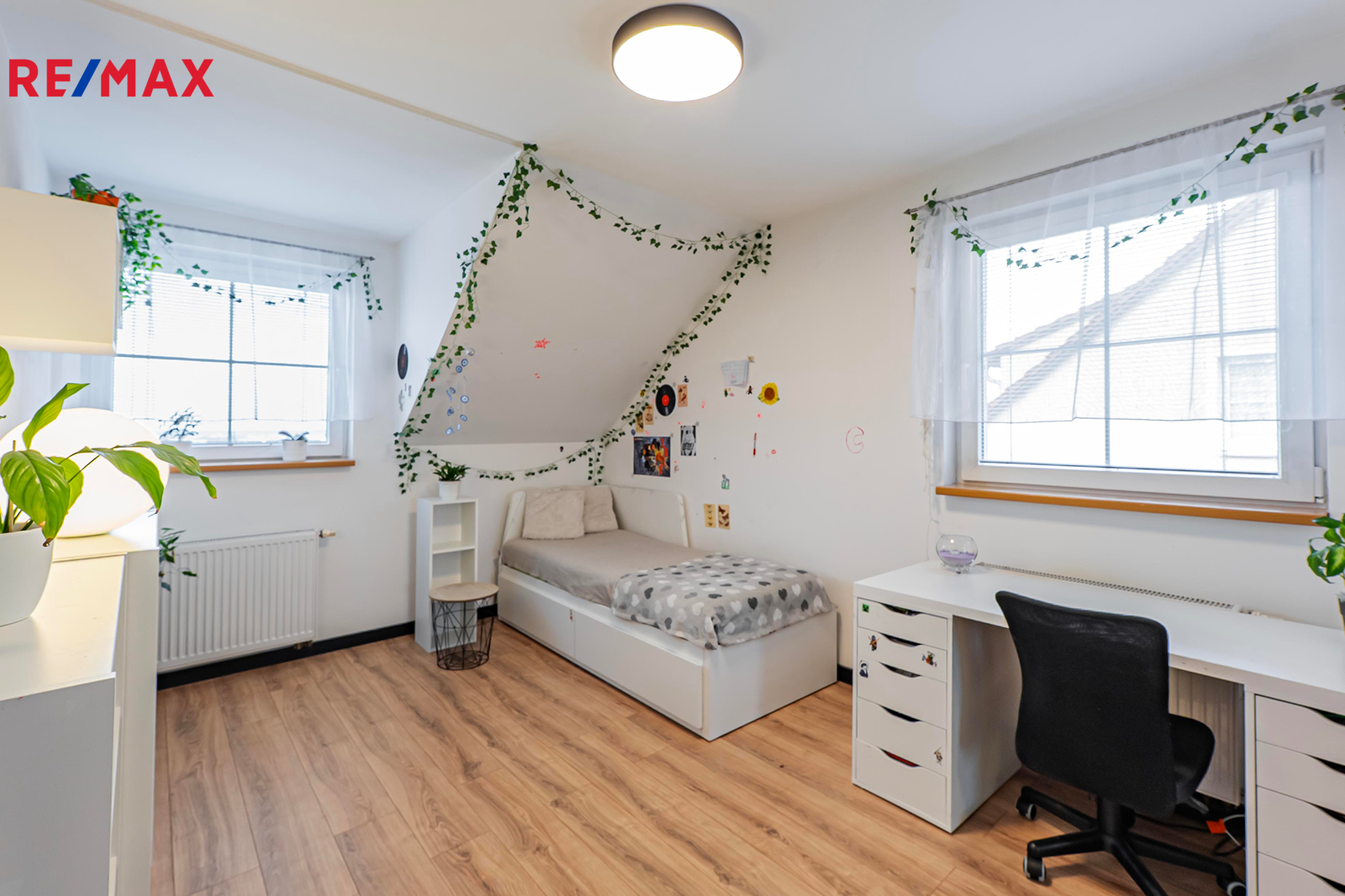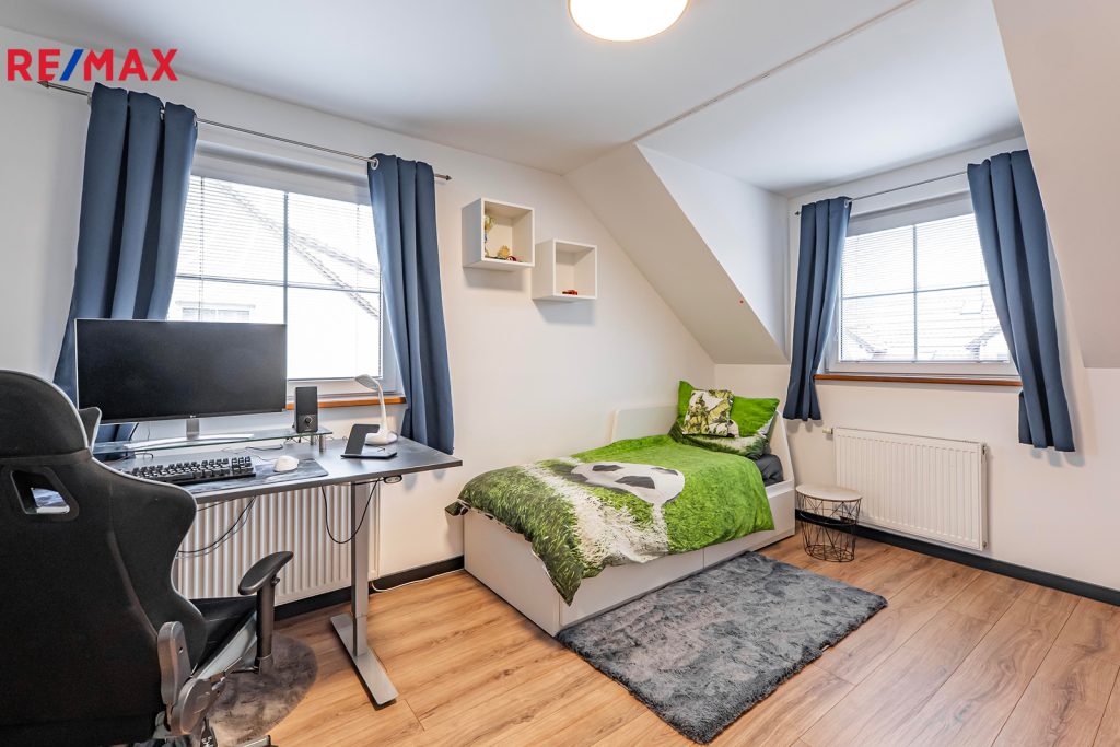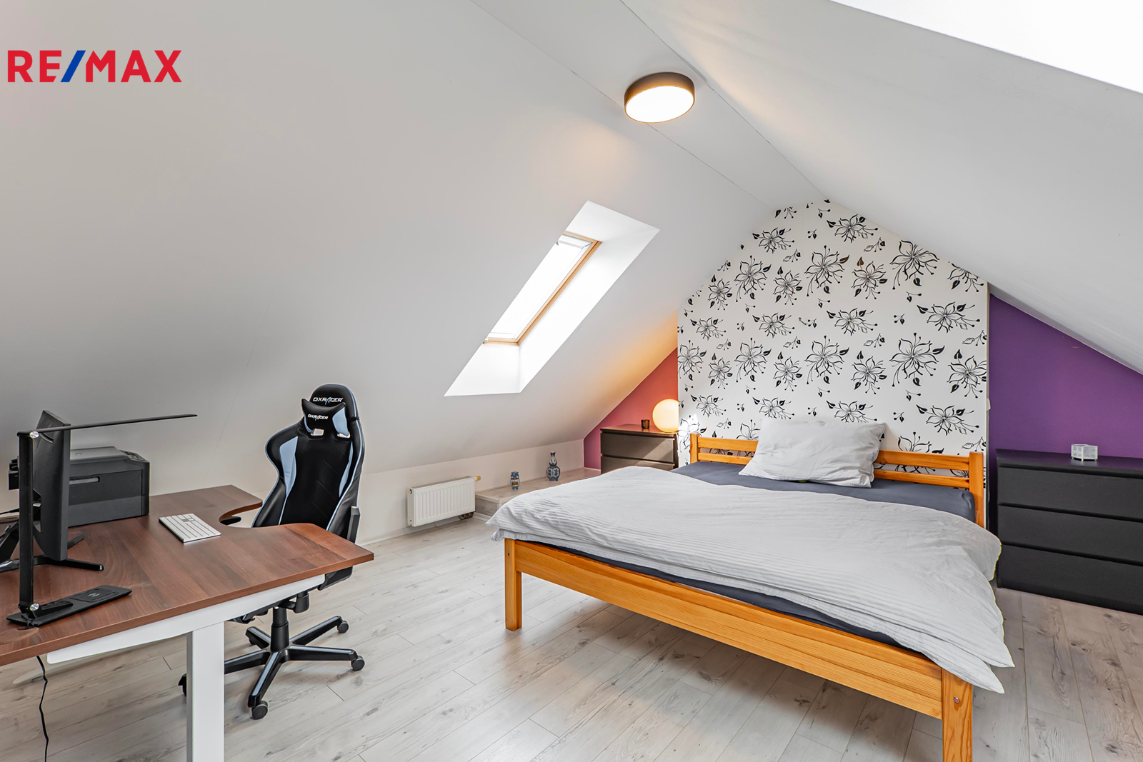 V dalším podlaží se nachází tři samostatné pokoje – aktuálně využívané jako dva dětské pokoje a pracovna – a druhá koupelna s vanou a toaletou. V podkroví je vybudována ložnice se střešními okny, která nabízí soukromí a klid pro odpočinek nebo práci z domova.