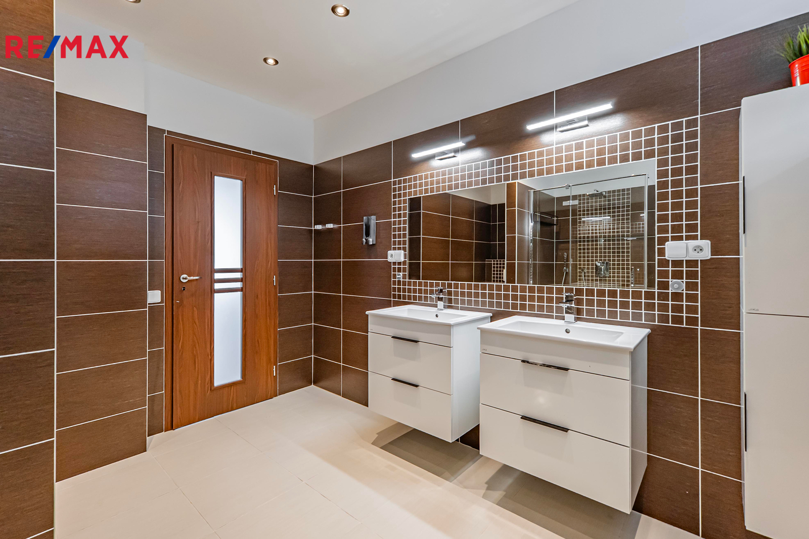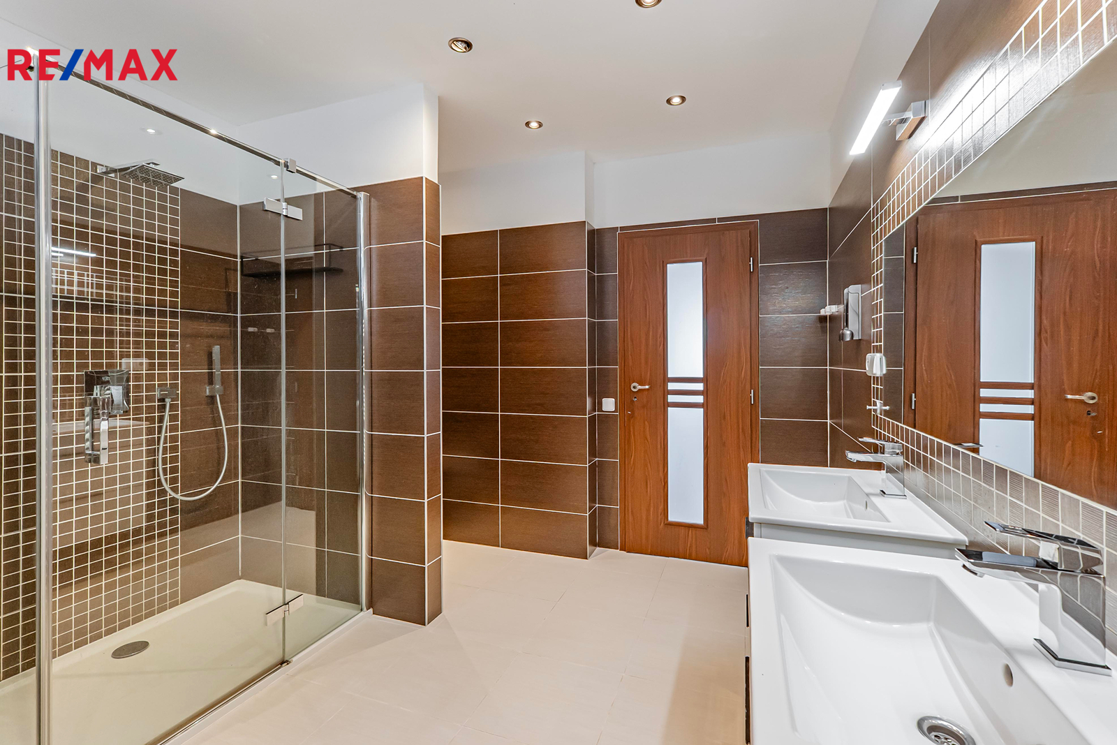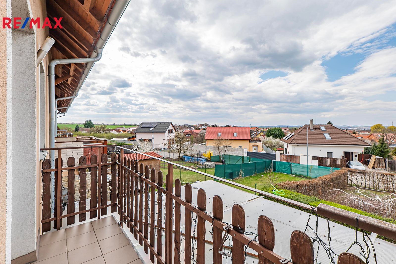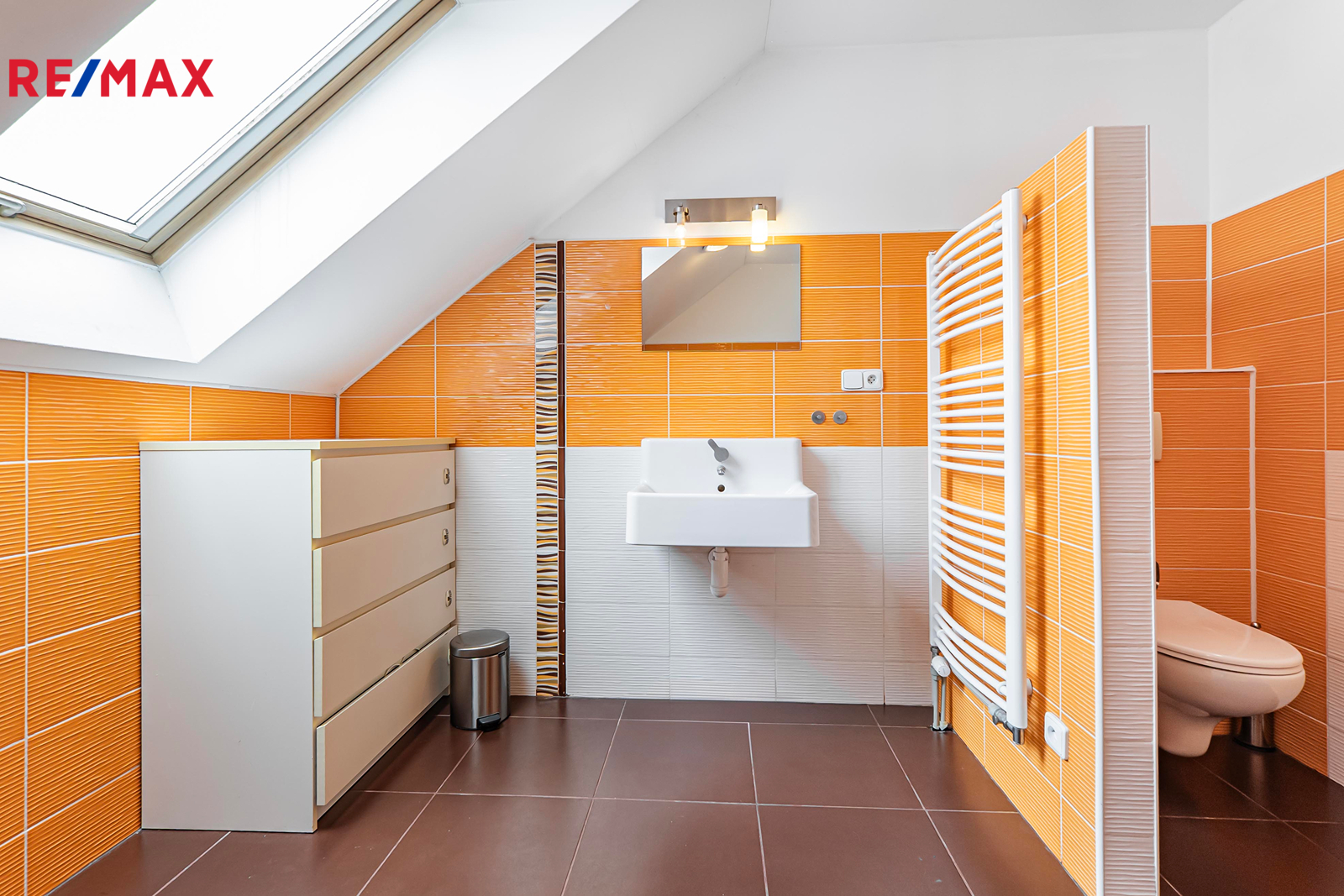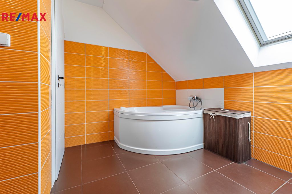 V dalším podlaží se nachází tři samostatné pokoje – aktuálně využívané jako dva dětské pokoje a pracovna – a druhá koupelna s vanou a toaletou. V podkroví je vybudována ložnice se střešními okny, která nabízí soukromí a klid pro odpočinek nebo práci z domova.