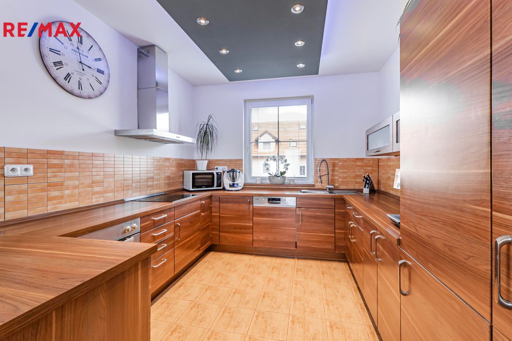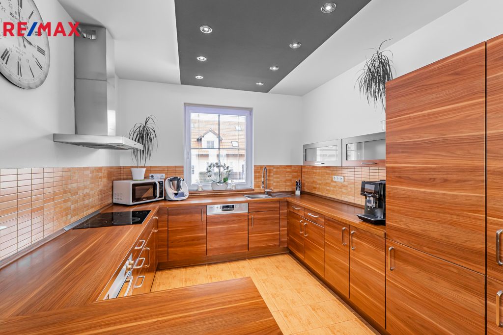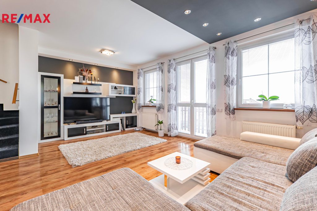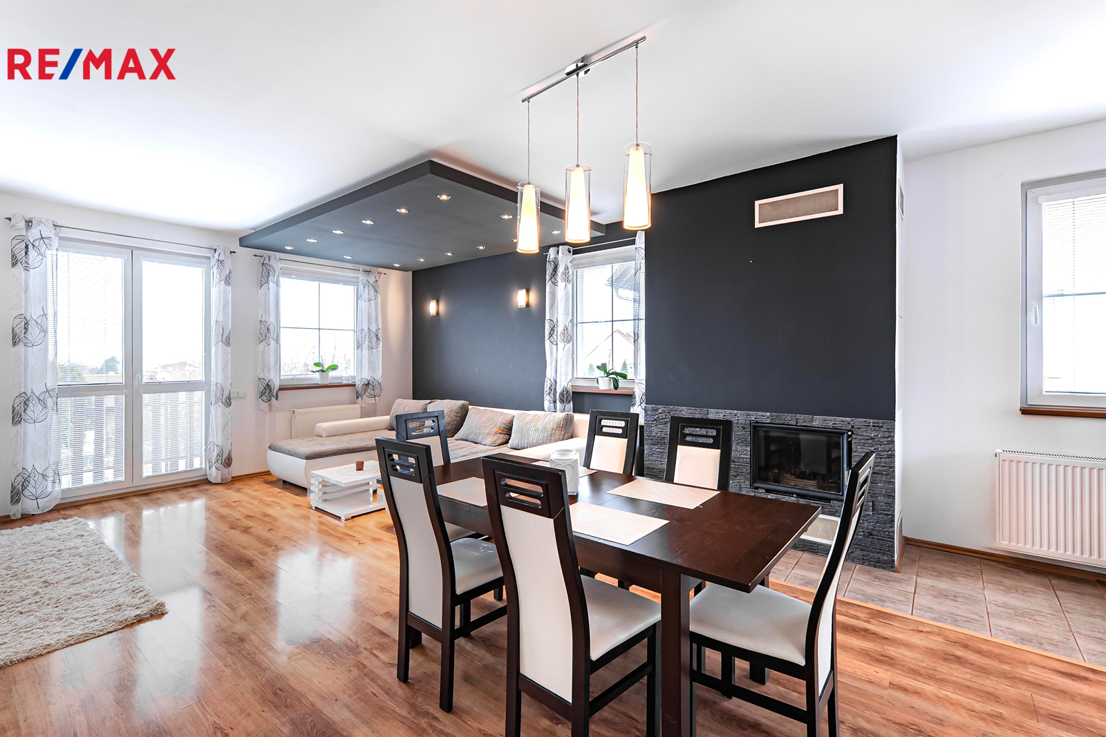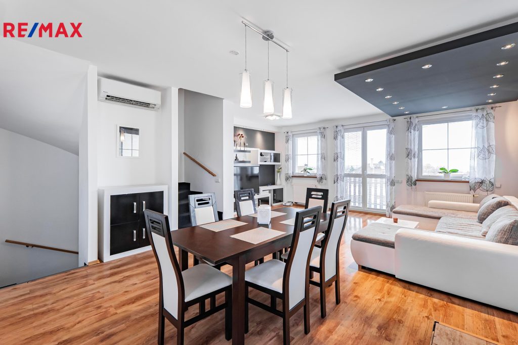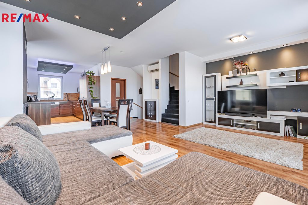 V hlavním obytném patře se nachází prostorný a světlý obývací pokoj propojený s moderní kuchyní a jídelním koutem. Kuchyňská linka je vybavena vestavěnými spotřebiči a poskytuje dostatek úložného i pracovního prostoru. Z obývací části je přímý vstup na balkon s výhledem do okolí. Koupelna na tomto patře je vybavena sprchovým koutem, dvojitým umyvadlem, WC a prostorem pro pračku i sušičku.