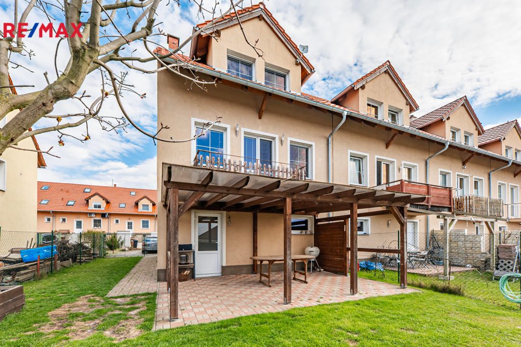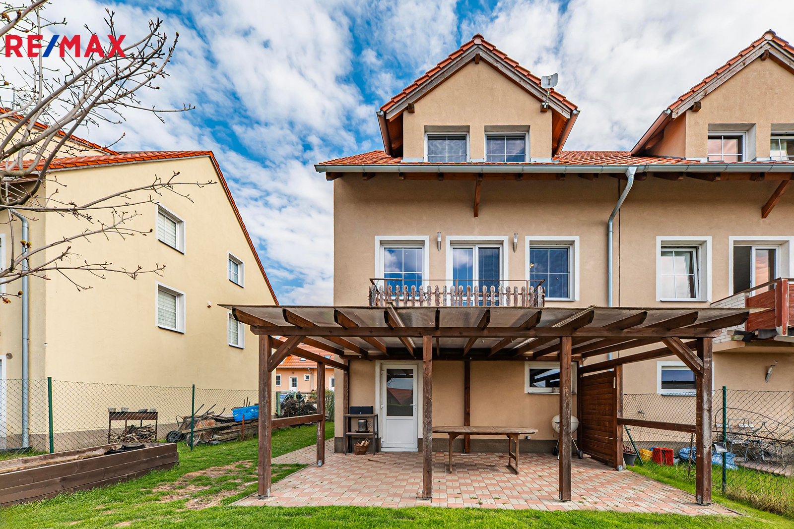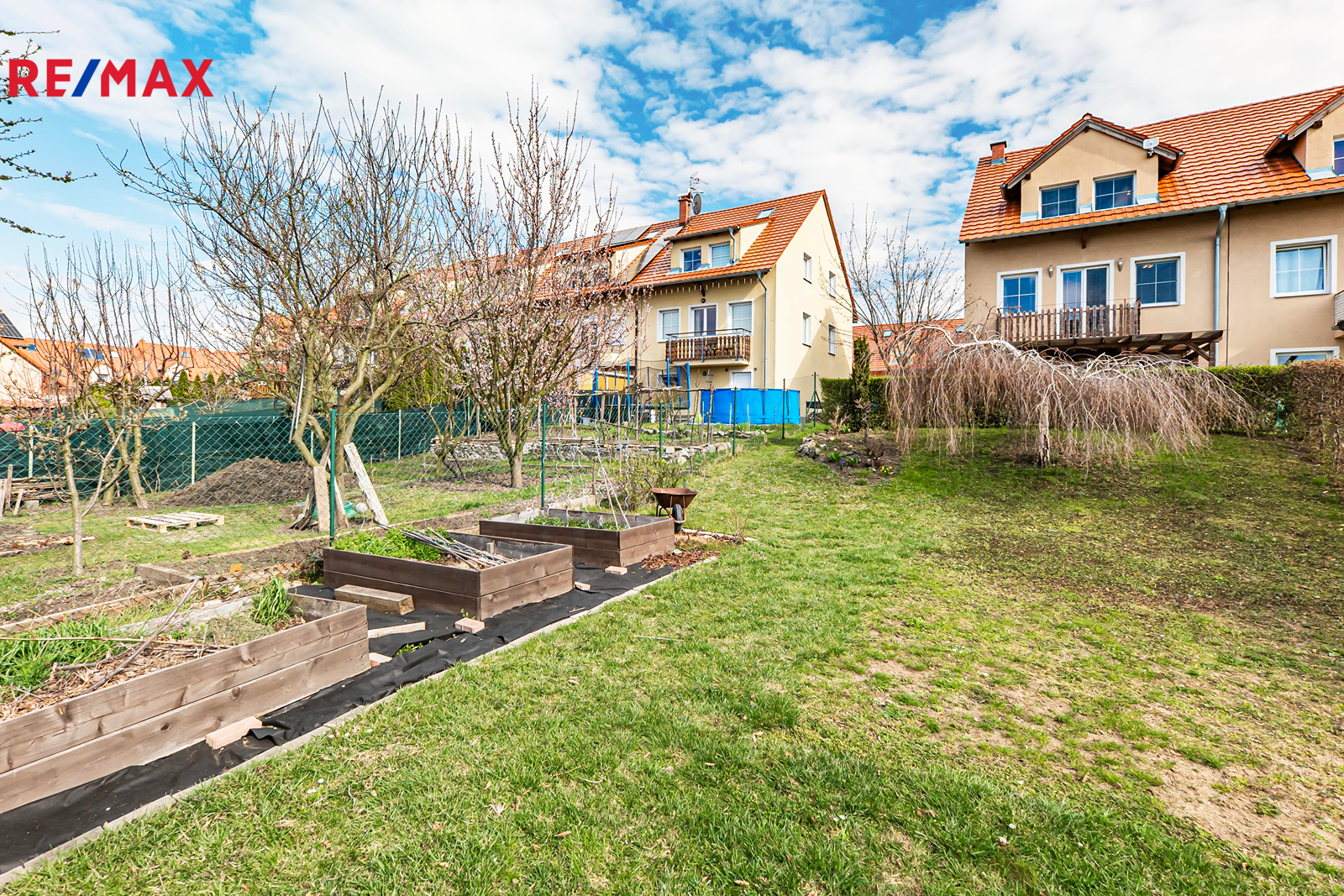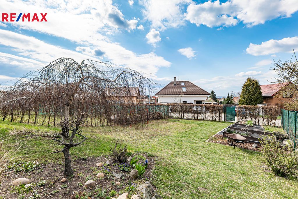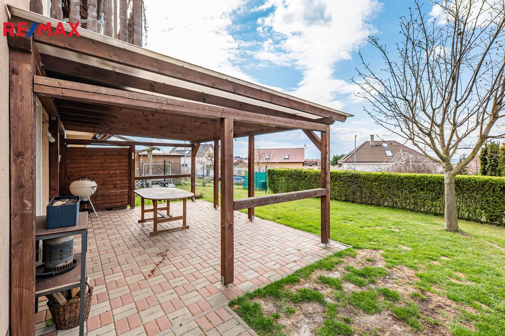 Za domem se rozprostírá udržovaná zahrada o rozloze přibližně 300 m². Najdete zde krytou pergolu s posezením pro letní večery, prostor pro pěstování nebo relaxaci a místo pro parkování. Kromě garáže je možné parkovat i před domem. Celková plocha pozemku je 391 m².