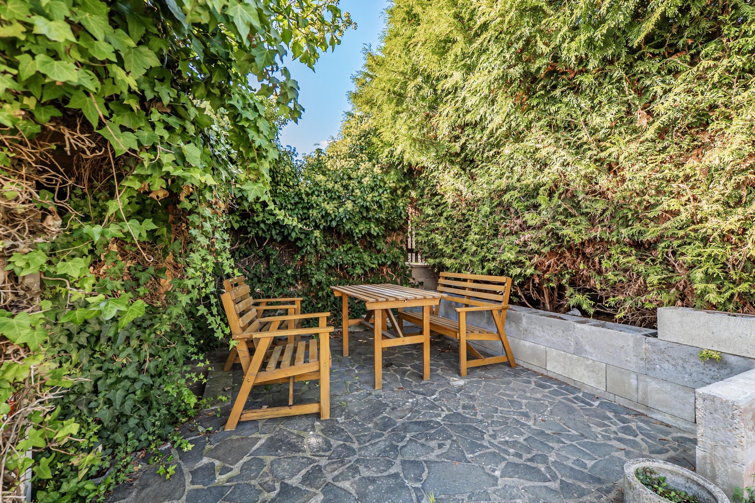 Součástí zahrady je také dřevěný přístřešek s venkovním krbem, který tvoří příjemné místo pro posezení nebo grilování.
