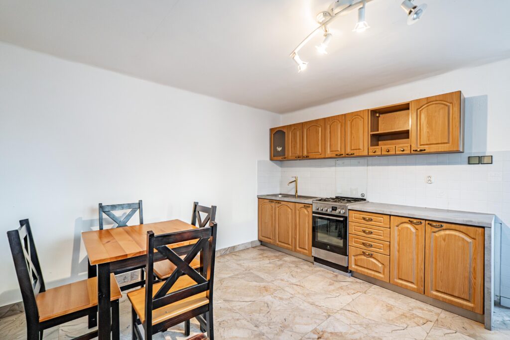 Větší bytová jednotka o dispozici 3+1 (cca 88 m²) nabízí prostornou vstupní halu, kuchyň, obývací pokoj, dvě ložnice, koupelnu, samostatné WC a vstup do sklepa.