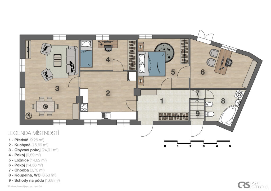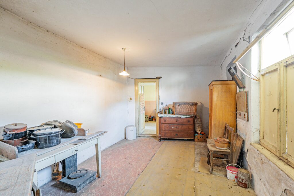 Dům je dispozičně řešen jako 4+1, zahrnuje vstupní chodbu, kuchyni, čtyři prostorné místnosti a sklad. K domu náleží prostorná půda, která skýtá možnost vybudování obytného podkroví. Dům je částečně podsklepen.