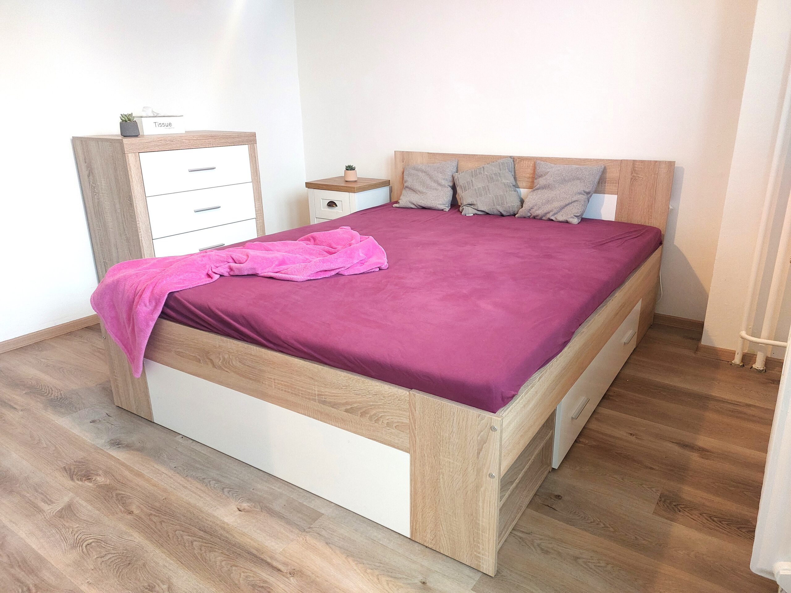 Ložnice: manželská postel, noční stolek, komoda, prostorná šatní skříň