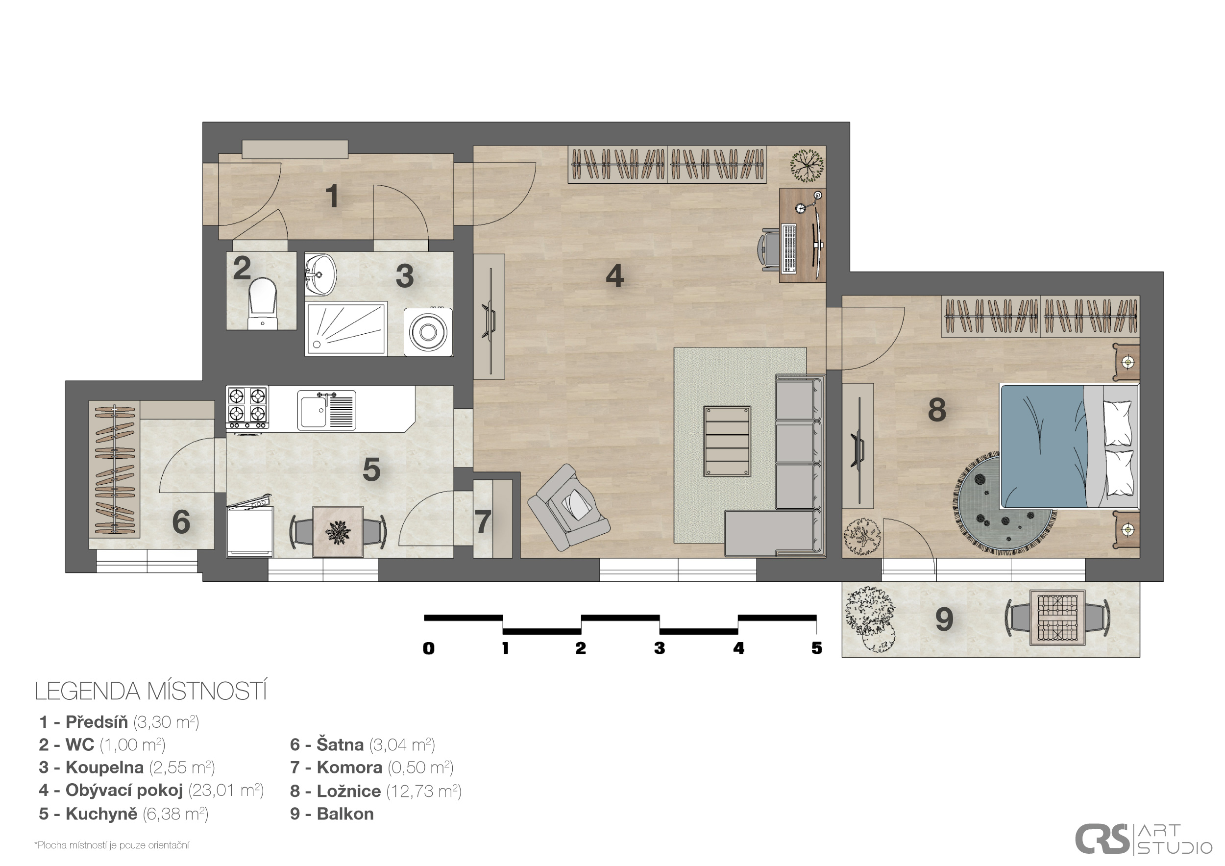 Bytová jednotka sestává z obývacího pokoje, ložnice se vstupem na balkón, samostatné kuchyně, šatny, koupelny, samostatného WC a sklepní kóje. Orientace bytu je na jihovýchod, což zajišťuje dostatek denního světla po většinu dne.