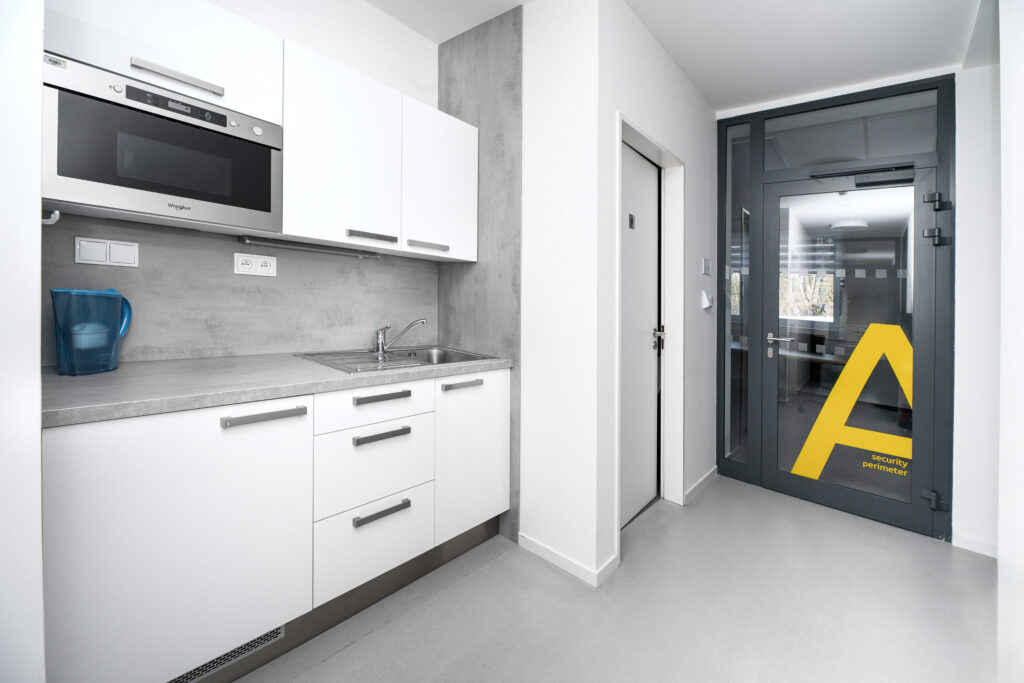 kuchyňky a samostatné toalety na každém patře, sprcha v objektu